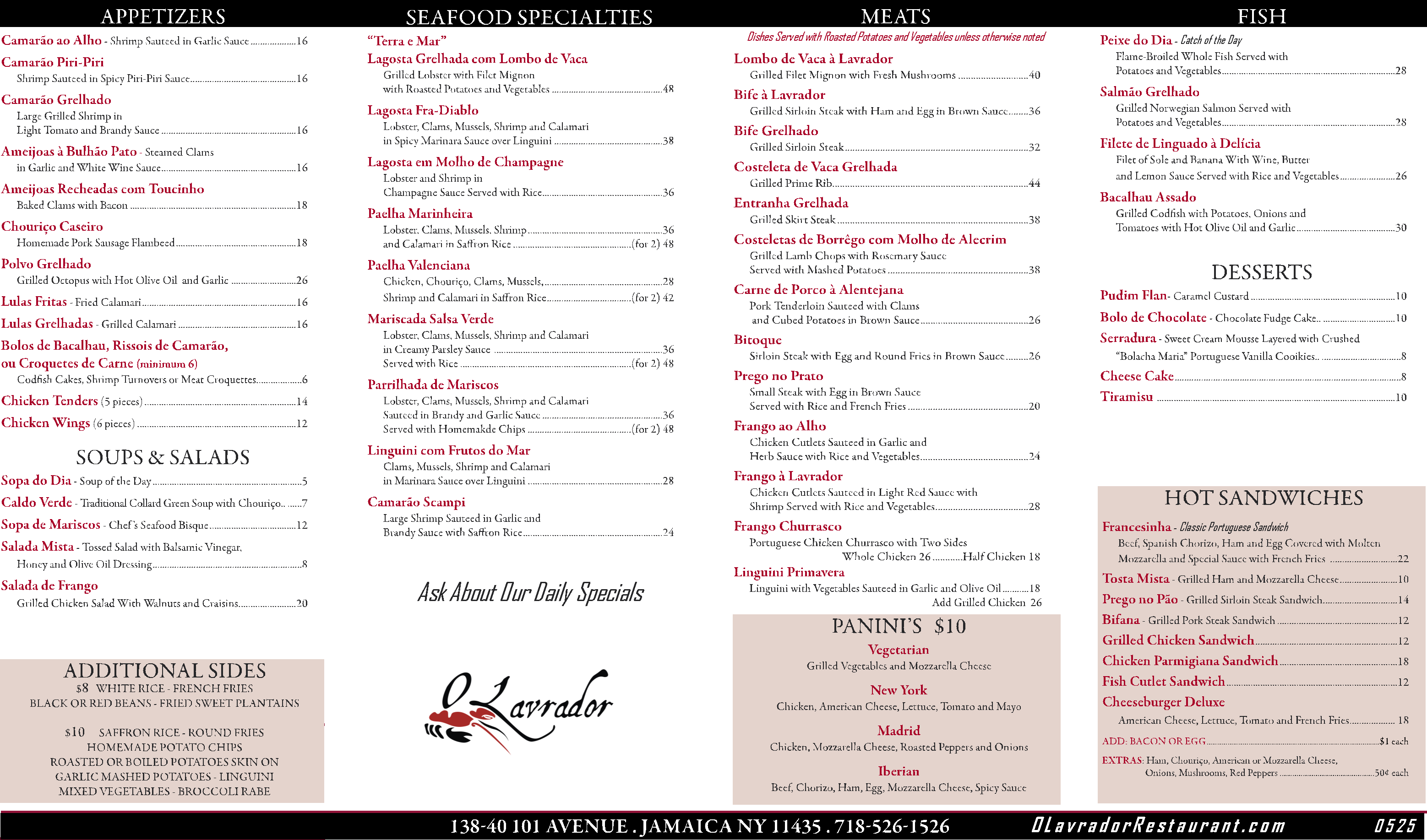 Chicken, Chouriço, Clams, Mussels, Shrimp and Calamari in Saffron Rice...28(for 2) 42